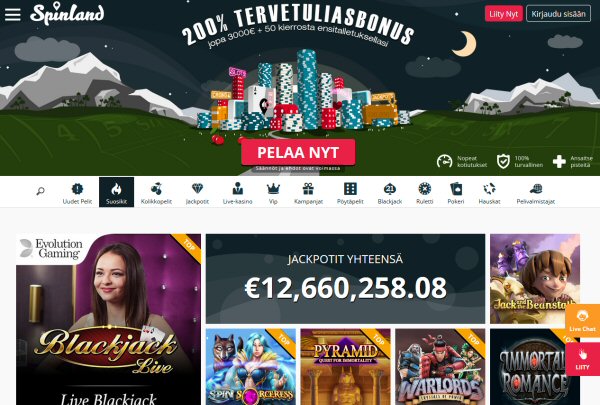 Spinland on kovan luokan kasino, jossa kaikki toimii kuten vuonna 2017 pitääkin. Mitään aivan mullistavaa se ei tarjoa - paitsi yhden kovimmista talletustarjouksista: 3000 € ensitalletusbonus + 500 € lisää kahteen seuraavaan talletukseen.