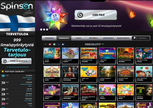 Mitä pitäisit virtaviivaisesta kasinosta, jossa vain pelataan? Spinsonilla kaikki turha ja ylimääräinen tilpehööri on karsittu ja keskitytty olennaiseen. Etusivulta löydät suosituimmat pelit, suurimmat voitot ja mehevimmät kampanjat - ja oikeastaan mitään muita sivuja ei sitten olekaan.